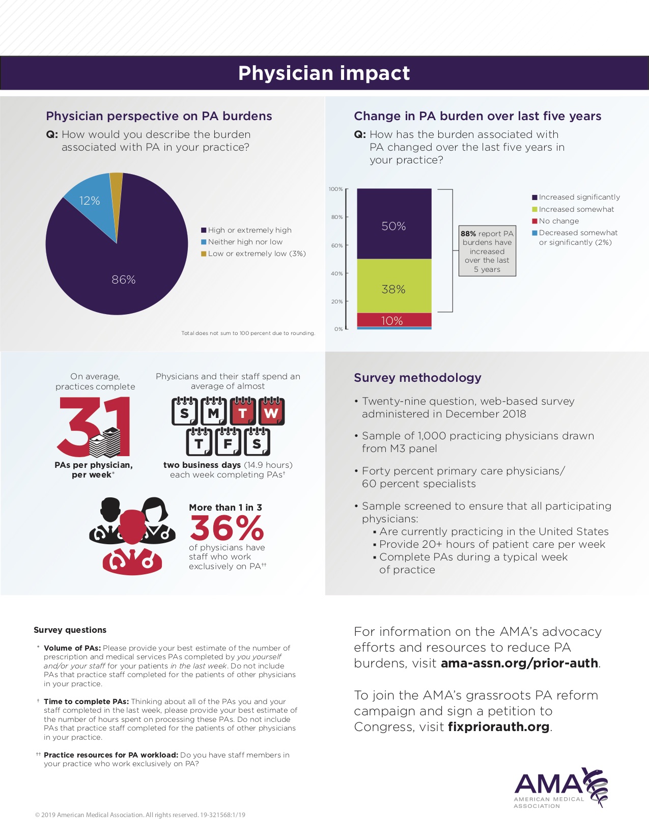 - To keep up with the administrative burden, 36 percent of physicians employ staff members who work exclusively on tasks associated with prior authorization.